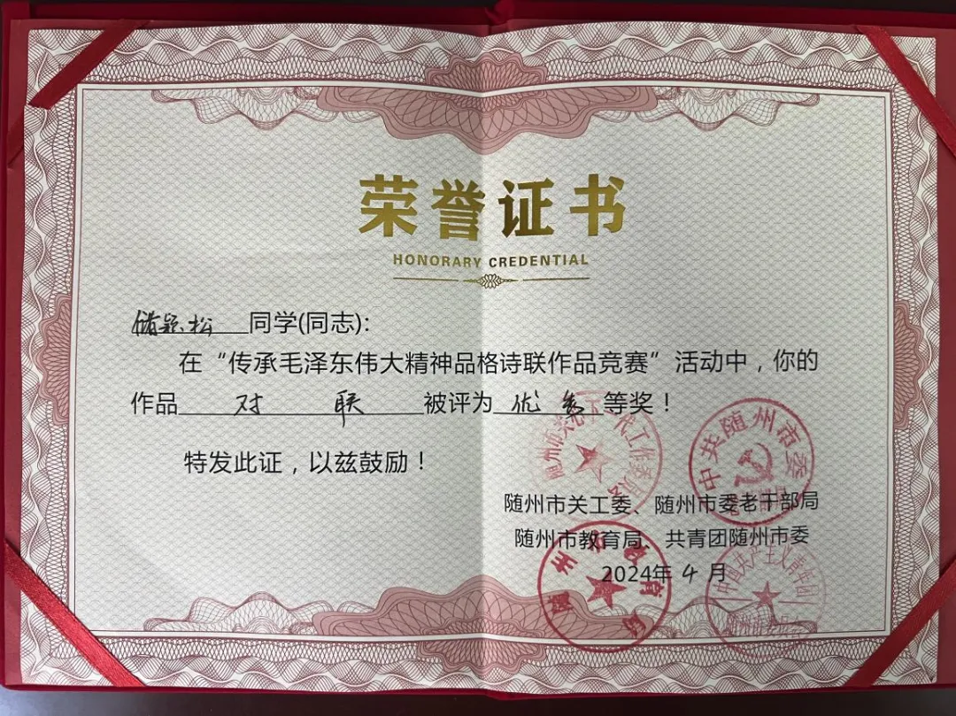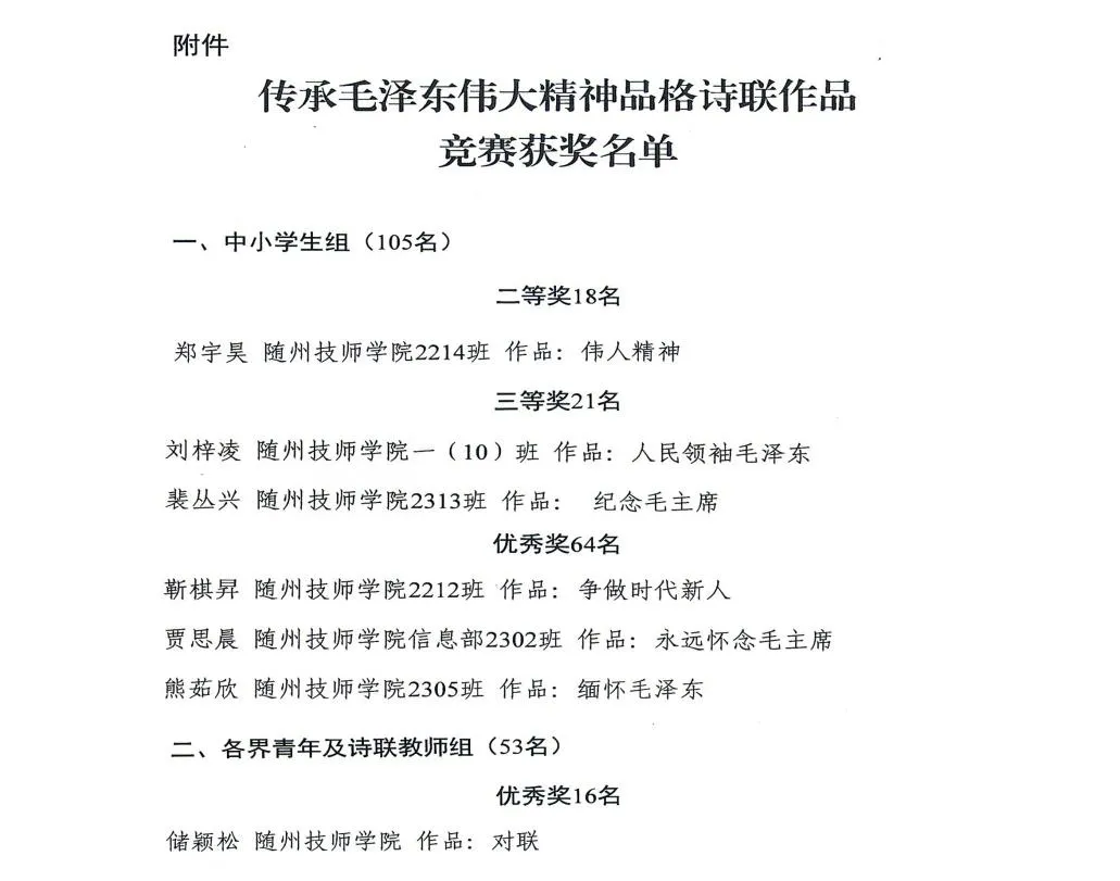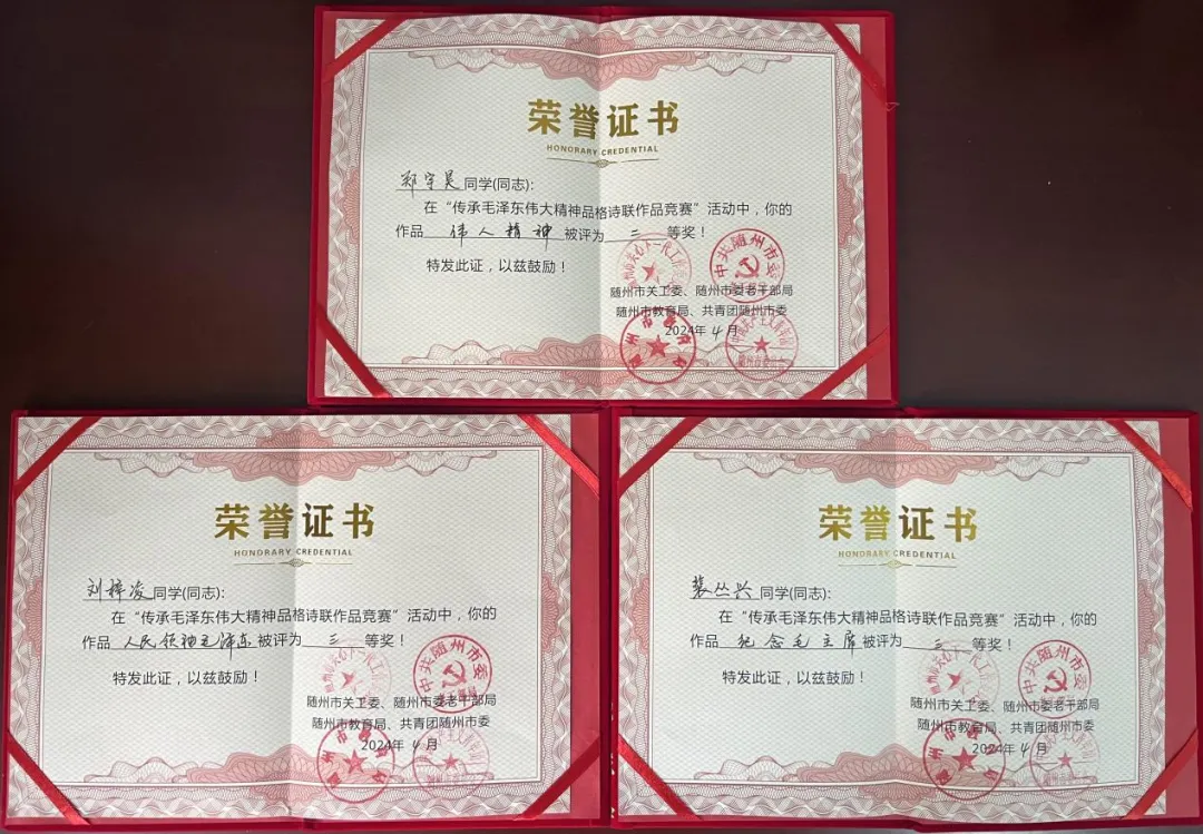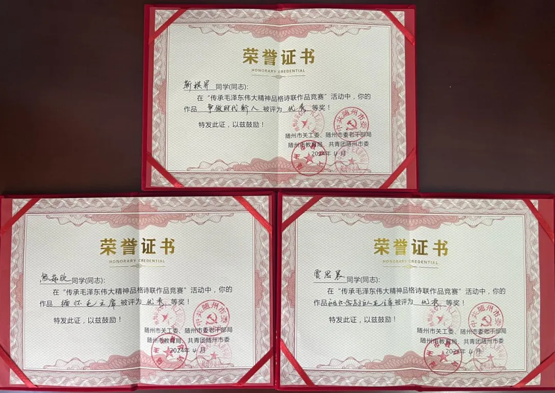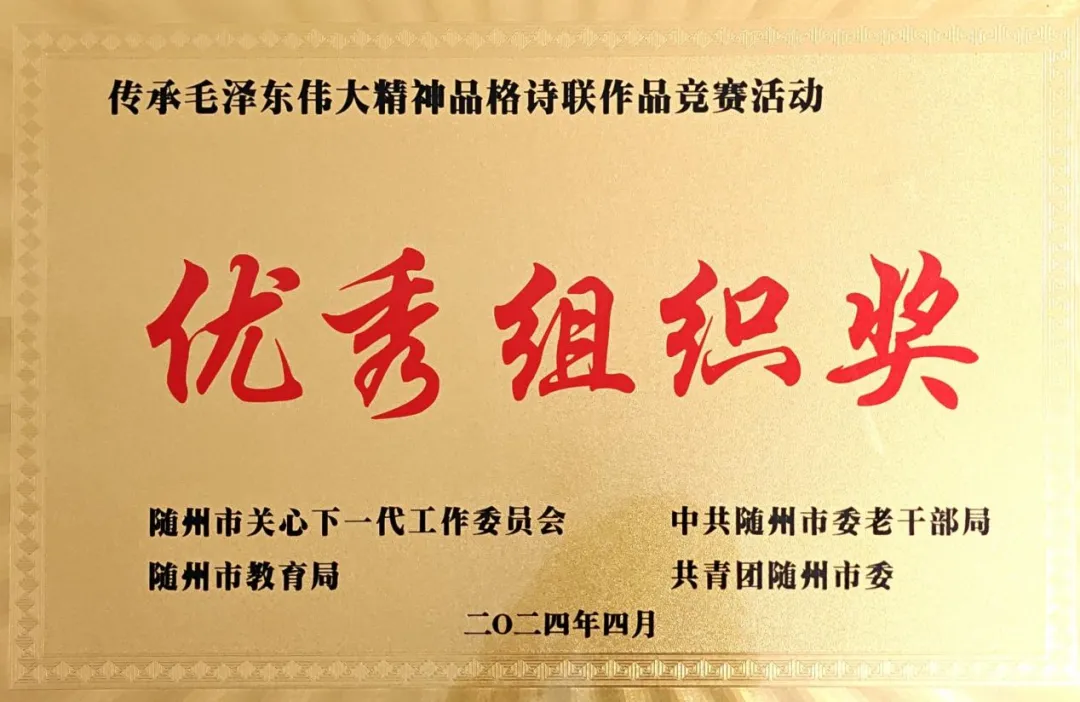 為深切緬懷毛澤(zé)東誕辰130周年,今年2月-4月,隨州市關(guān)工委、市老幹部局、市教育局、市(shì)團委聯合(hé)舉(jǔ)辦了“傳承毛澤東偉大精(jīng)神品(pǐn)格詩聯作(zuò)品競賽”。我院師生積極響應(yīng),踴躍參與,在比賽(sài)中斬獲佳績。同時,學院(yuàn)榮獲優秀組織獎。